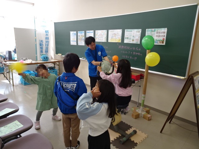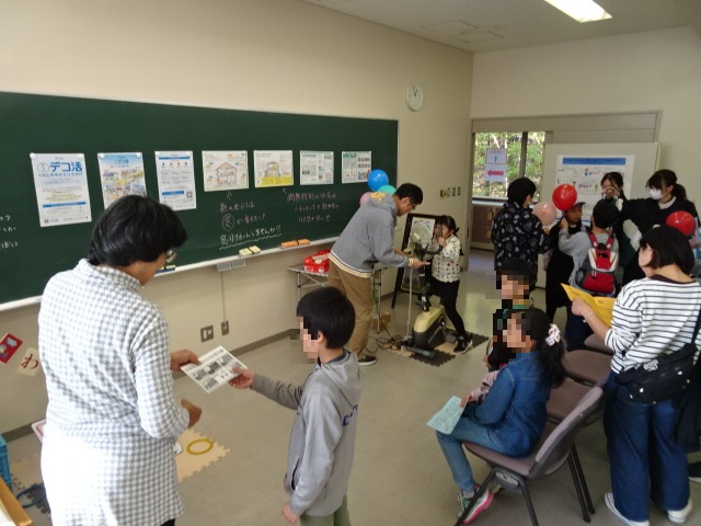 自転車発電は特に好評で、多くの子どもたちに体験してもらいました。自転車をこいだ後は、「疲れた~」、「大変だ」といった声が聞こえ、電気をつくる大変さを分かってもらえたと思います。自分で発電して膨らませた風船は持ち帰ってもらいました。